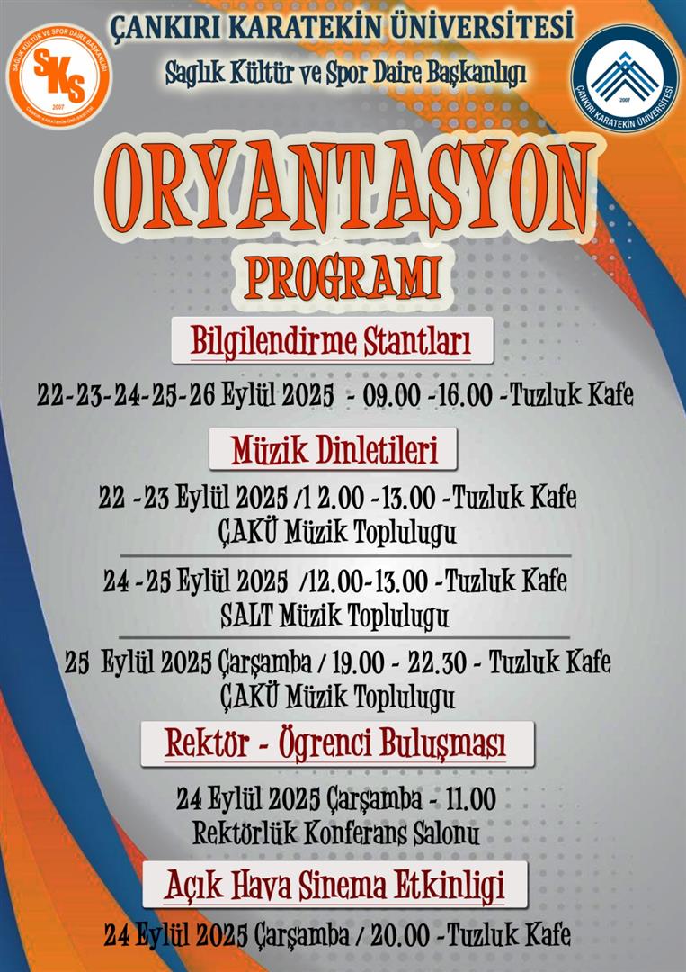 Bölümümüz oryantasyon eğitimine ek olarak üniversite genelinde ayrı bir oryantasyon etkinliği düzenlenecektir. Etkinlik afişi aşağıda verilmiş olup etkinlik programı için tıklayınız.